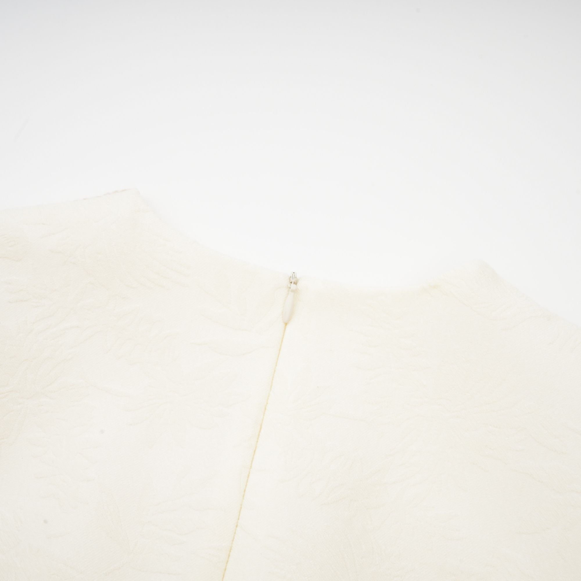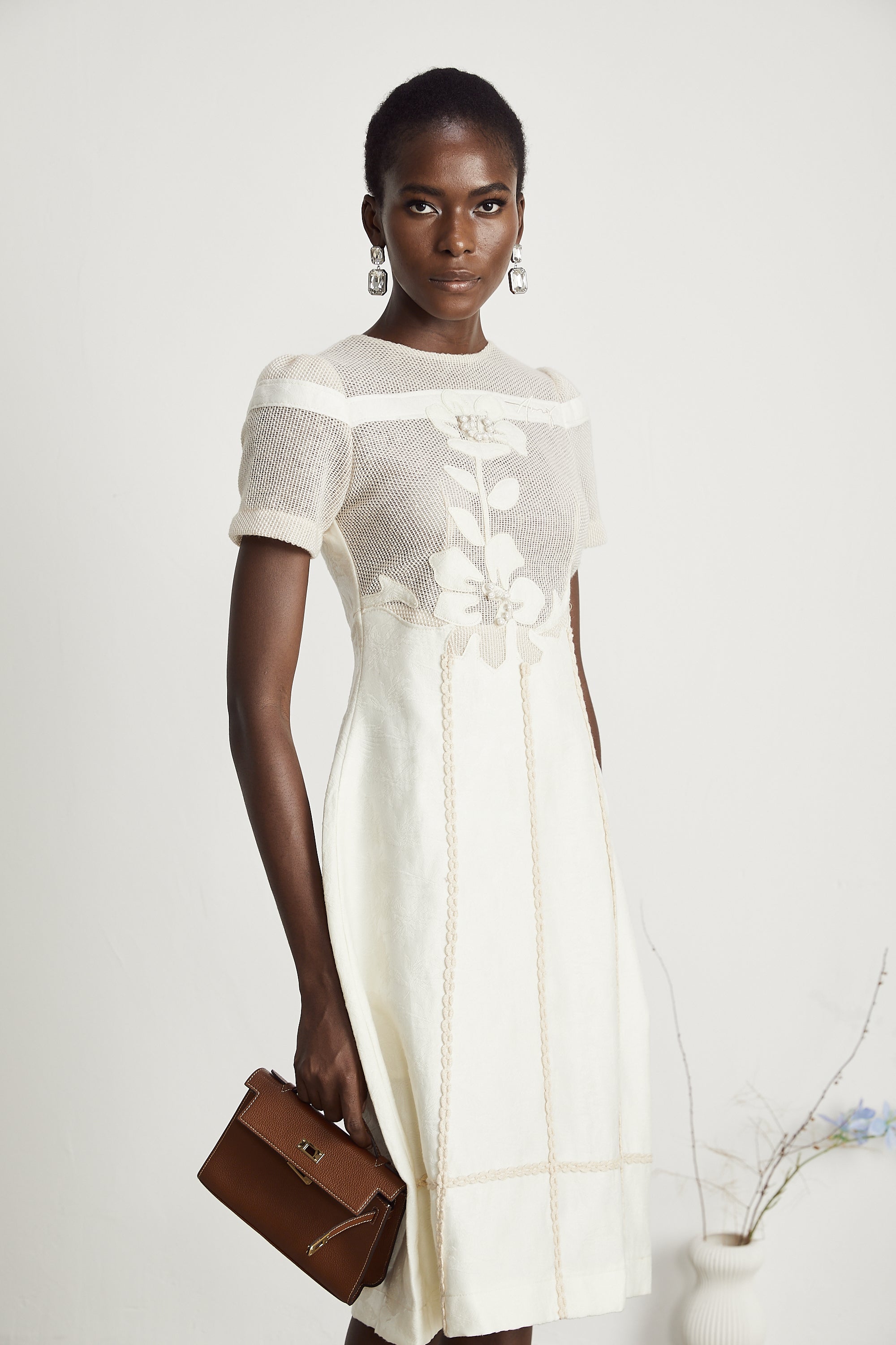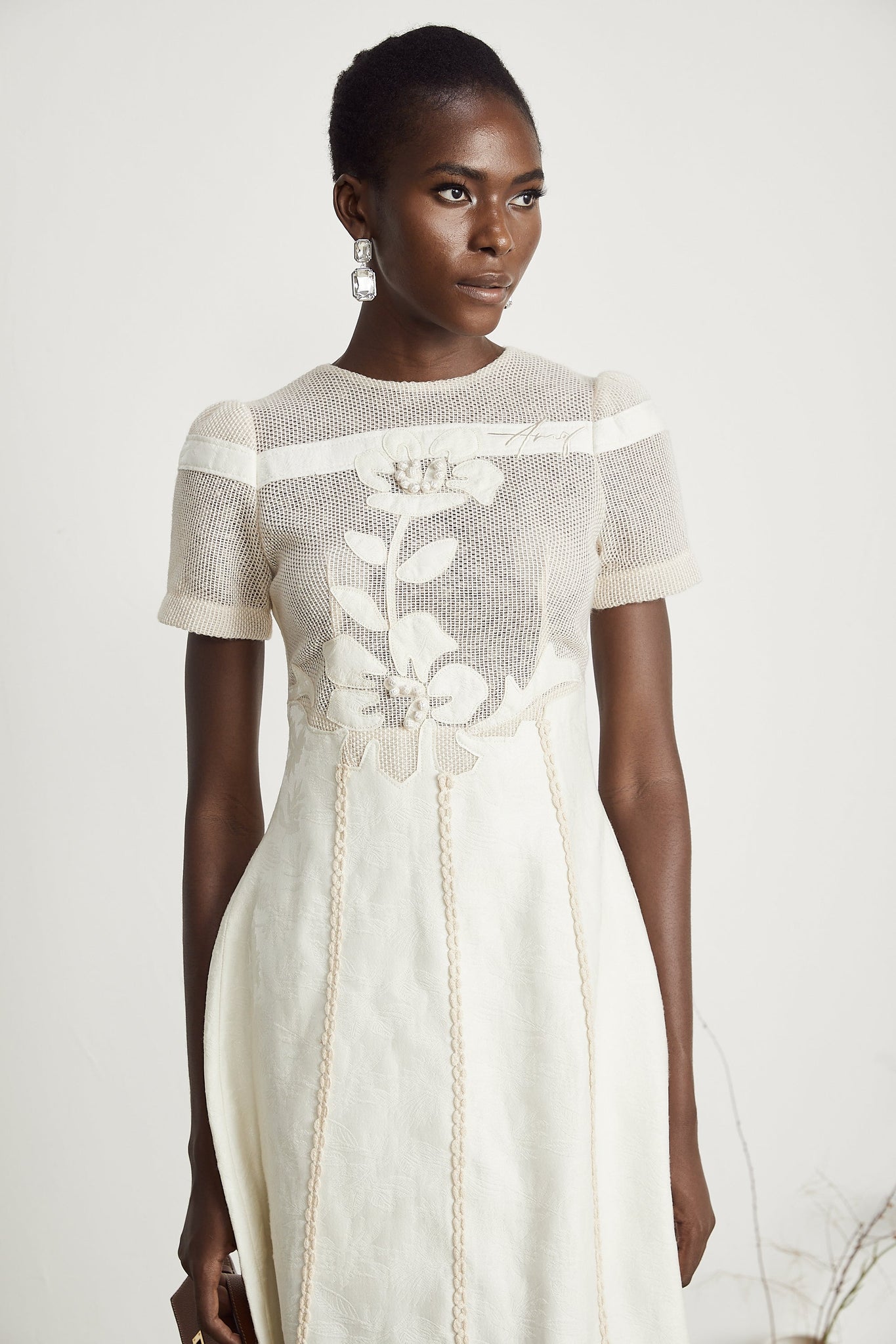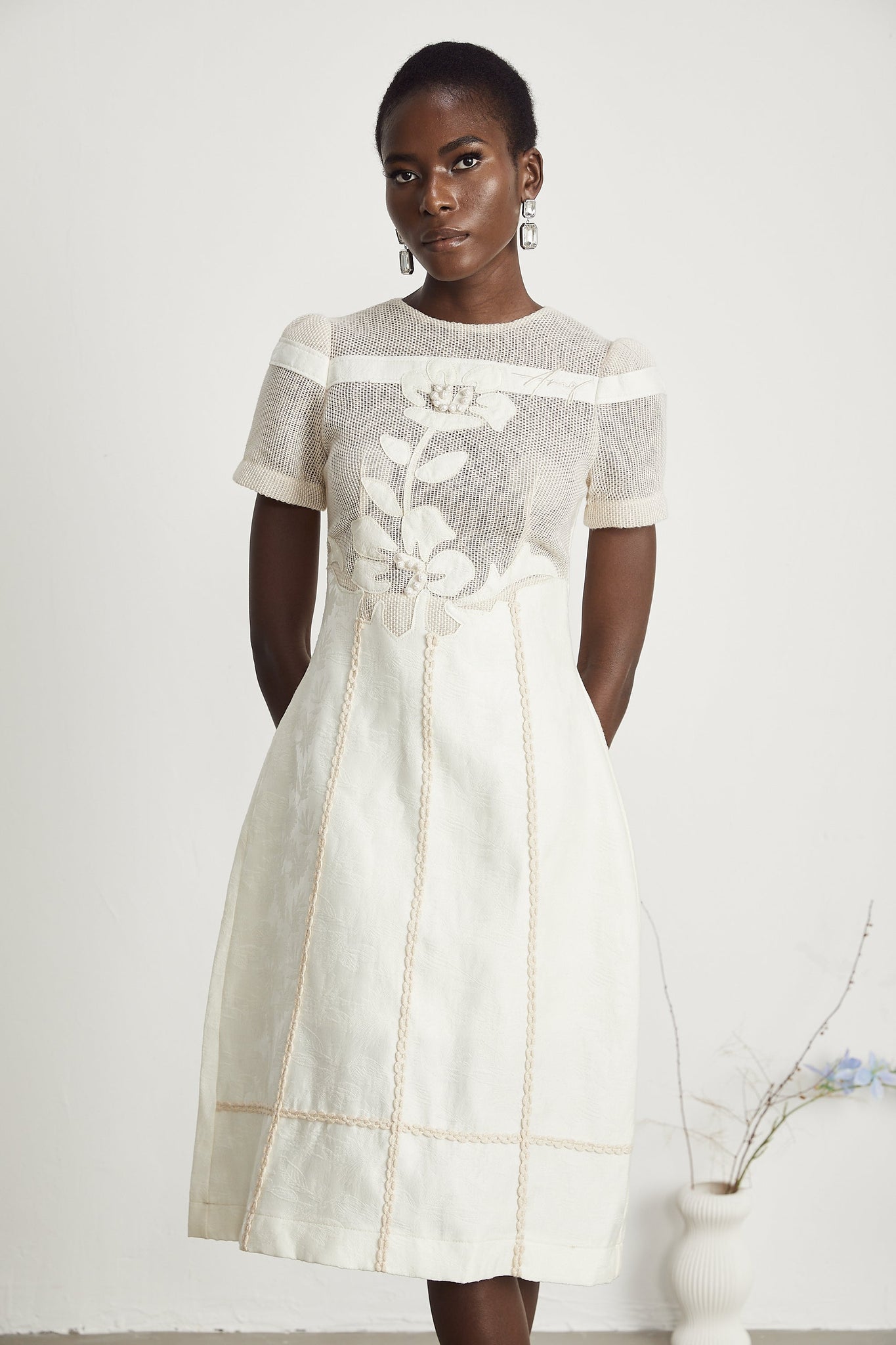 Structured off-white midi dress featuring floral embroidery and openwork panel details. The short sleeves and cinched waist offer a refined silhouette with artisanal charm.