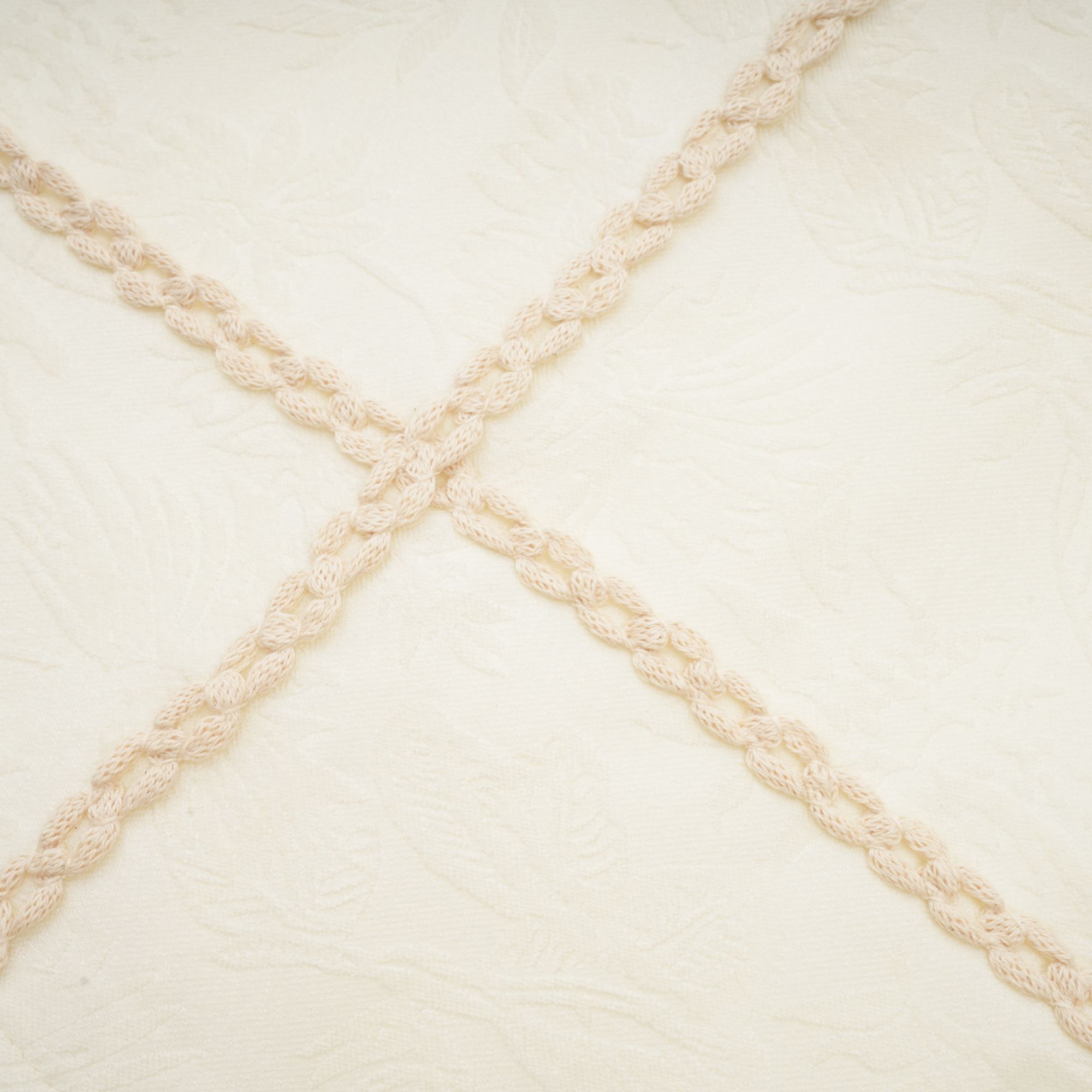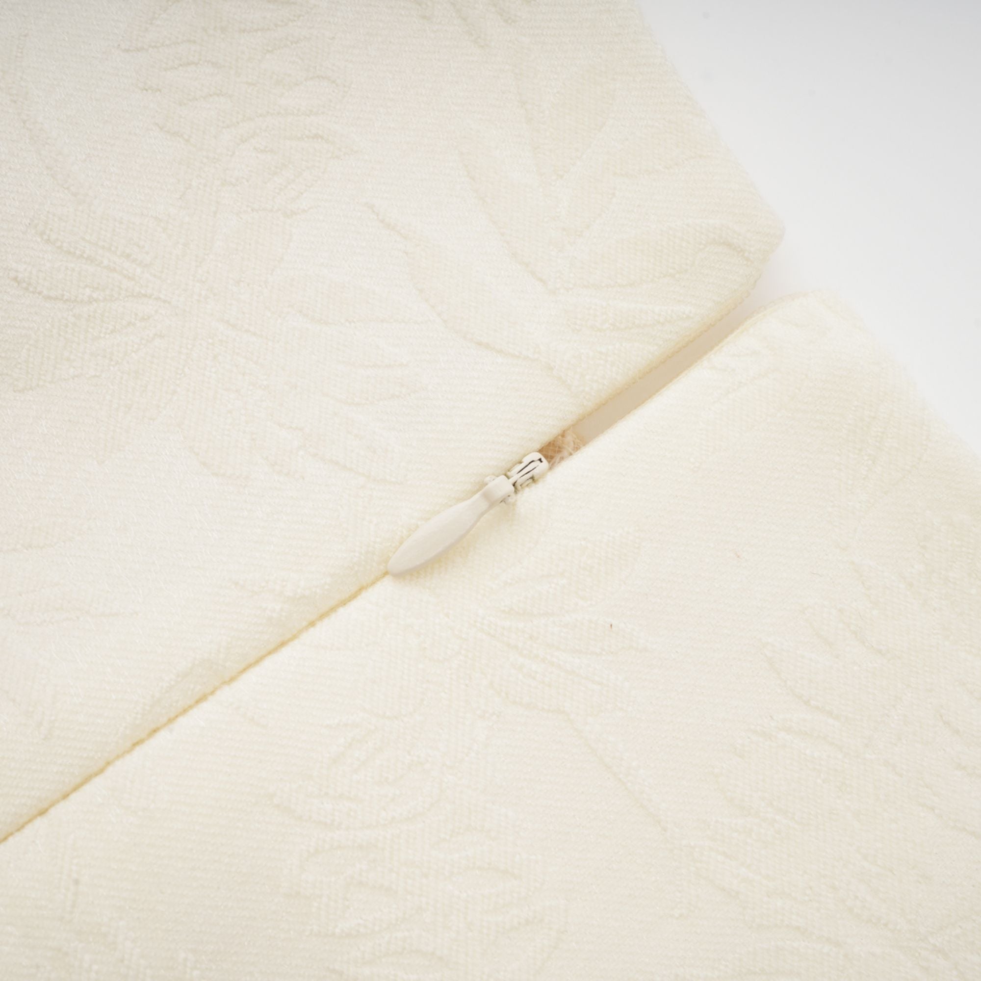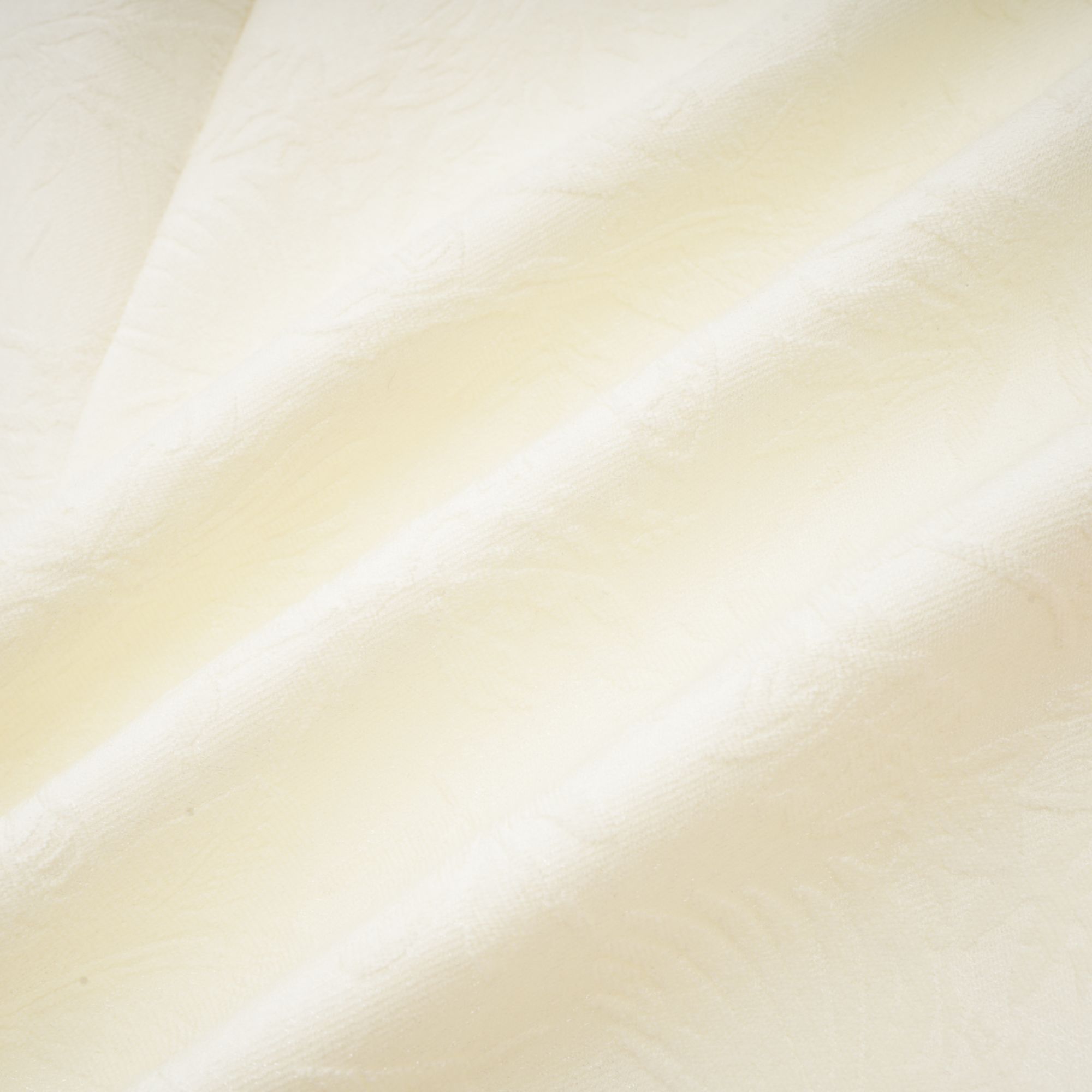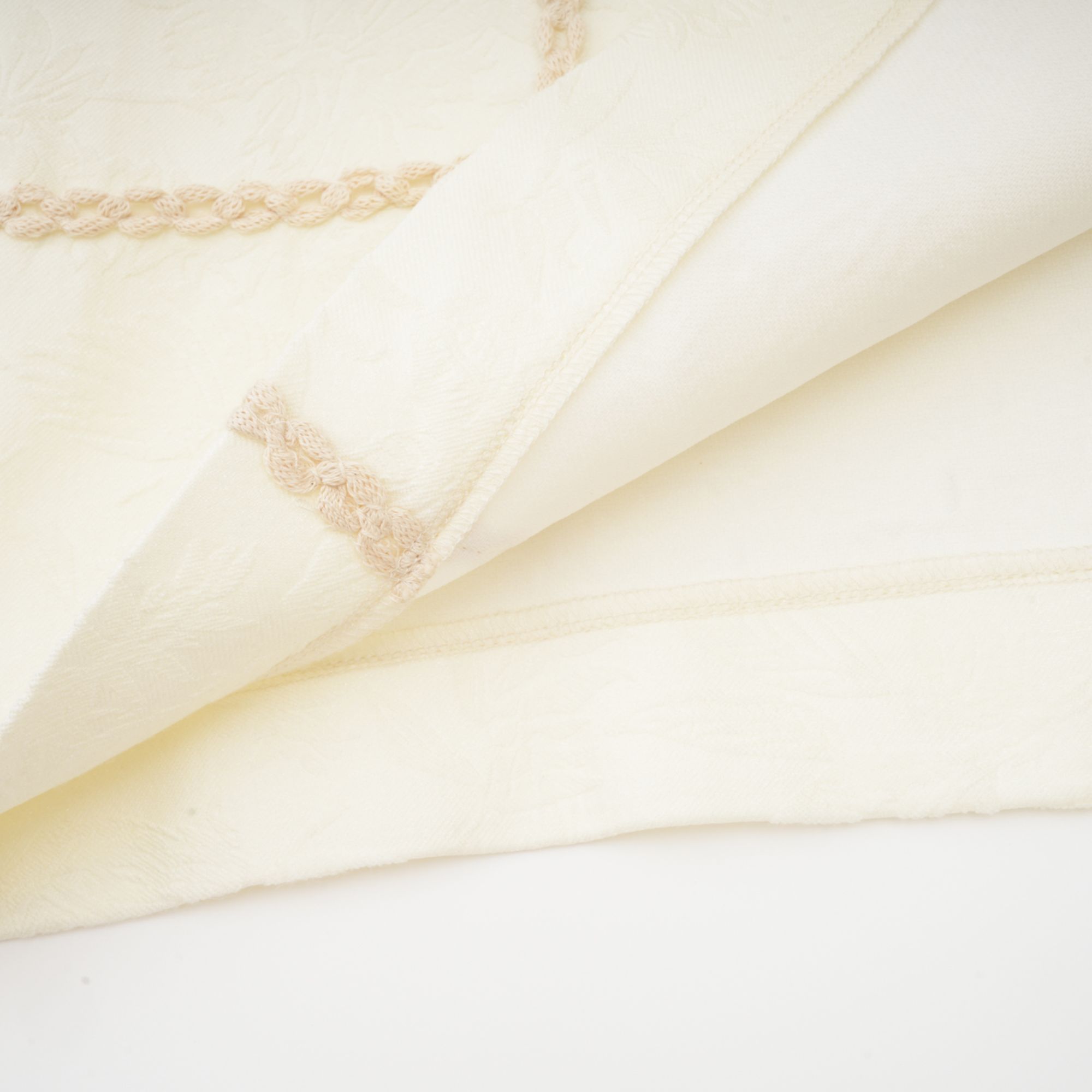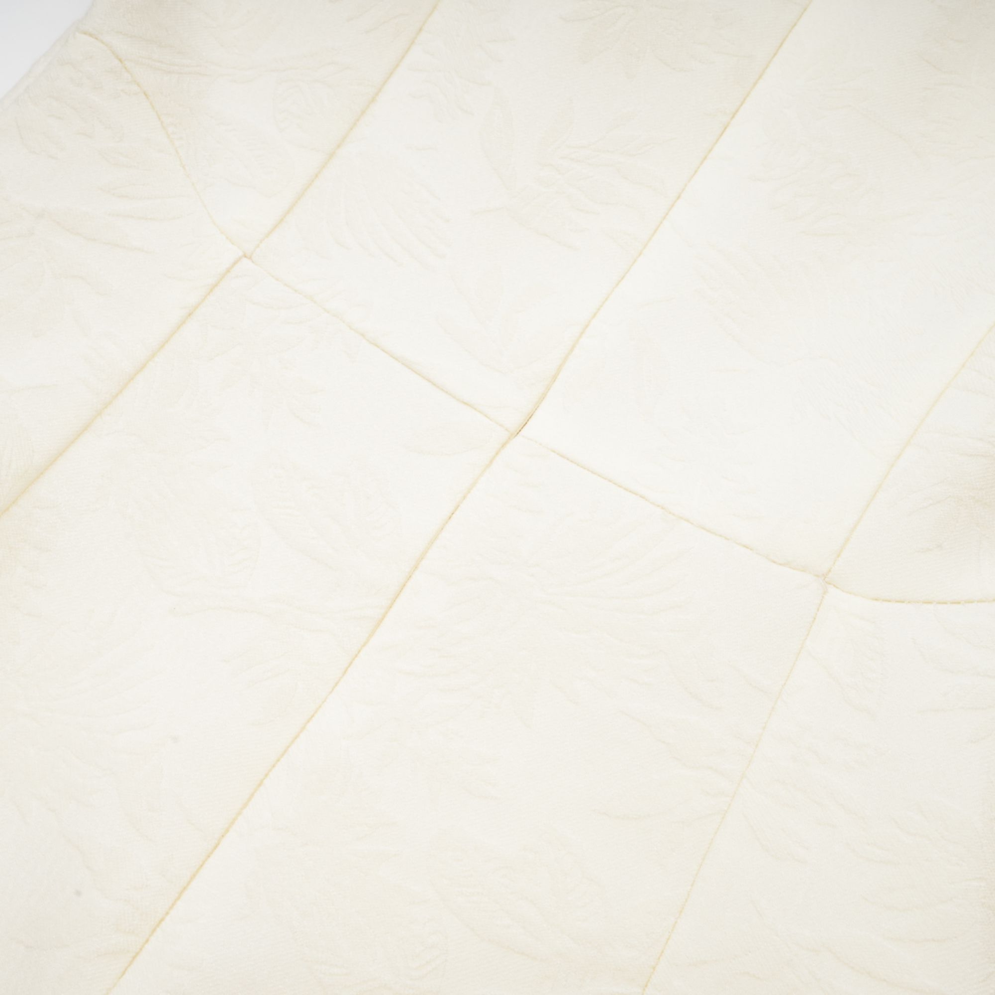 Structured off-white midi dress featuring floral embroidery and openwork panel details. The short sleeves and cinched waist offer a refined silhouette with artisanal charm.