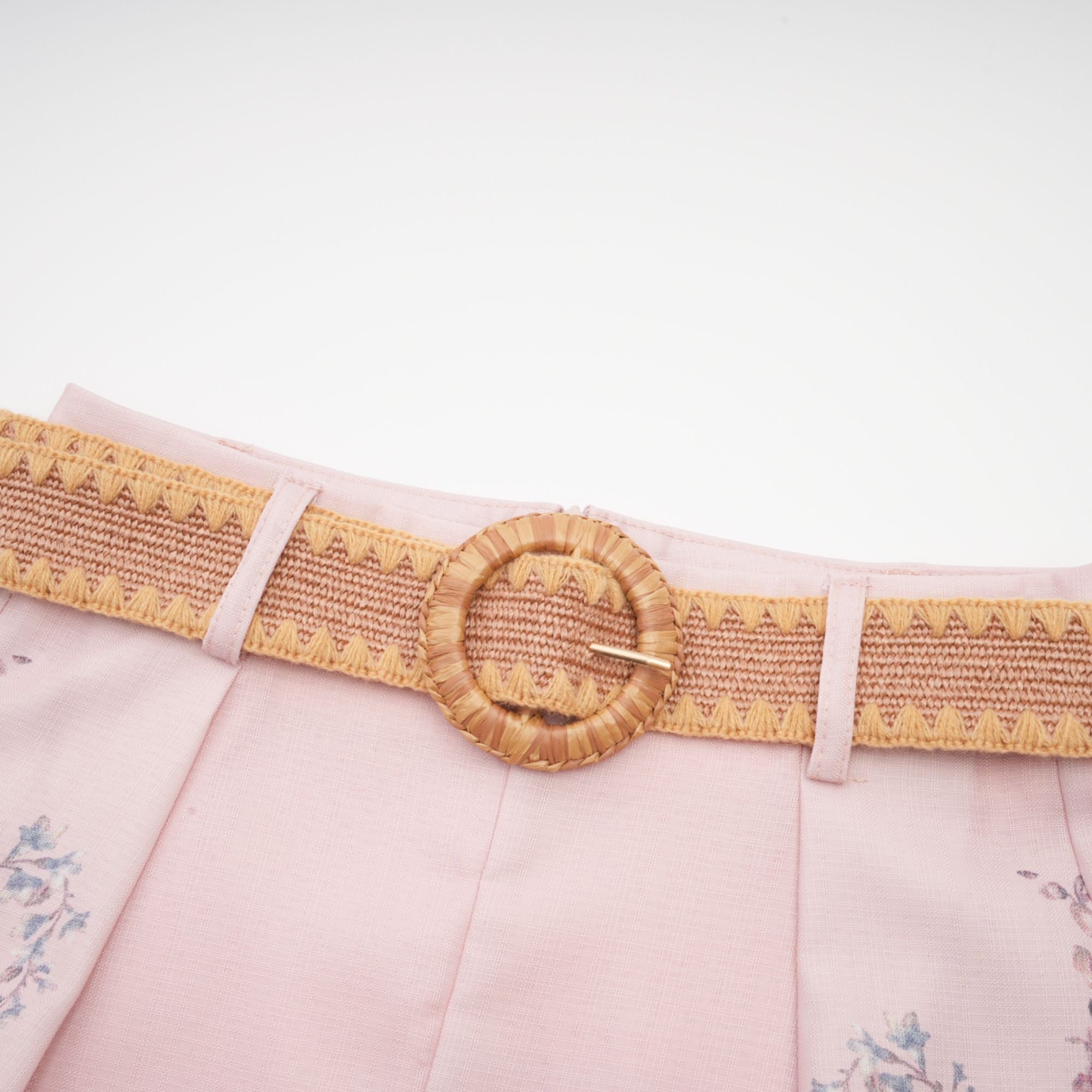 Lightweight set with high-neck puff-sleeve blouse and floral tailored shorts.