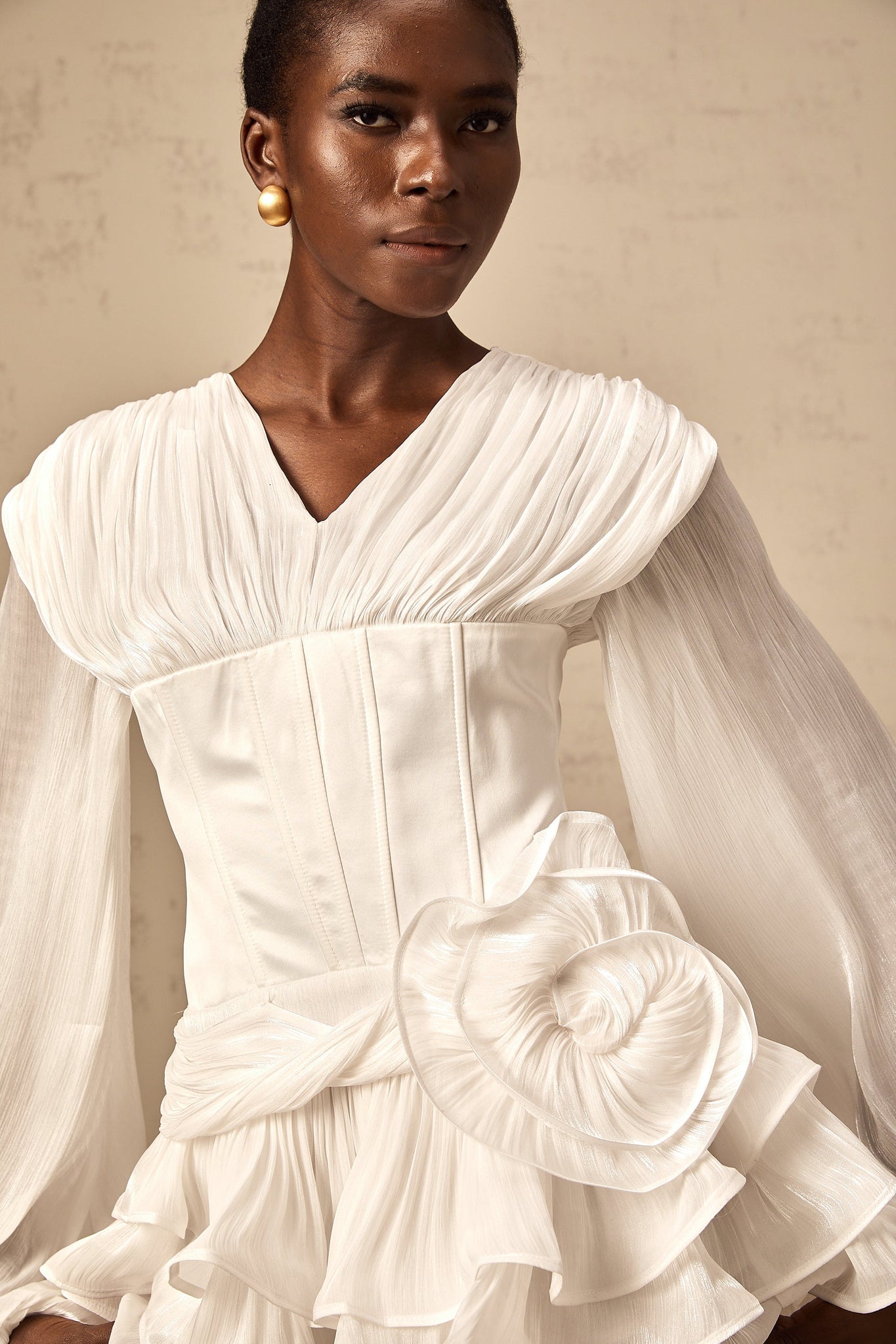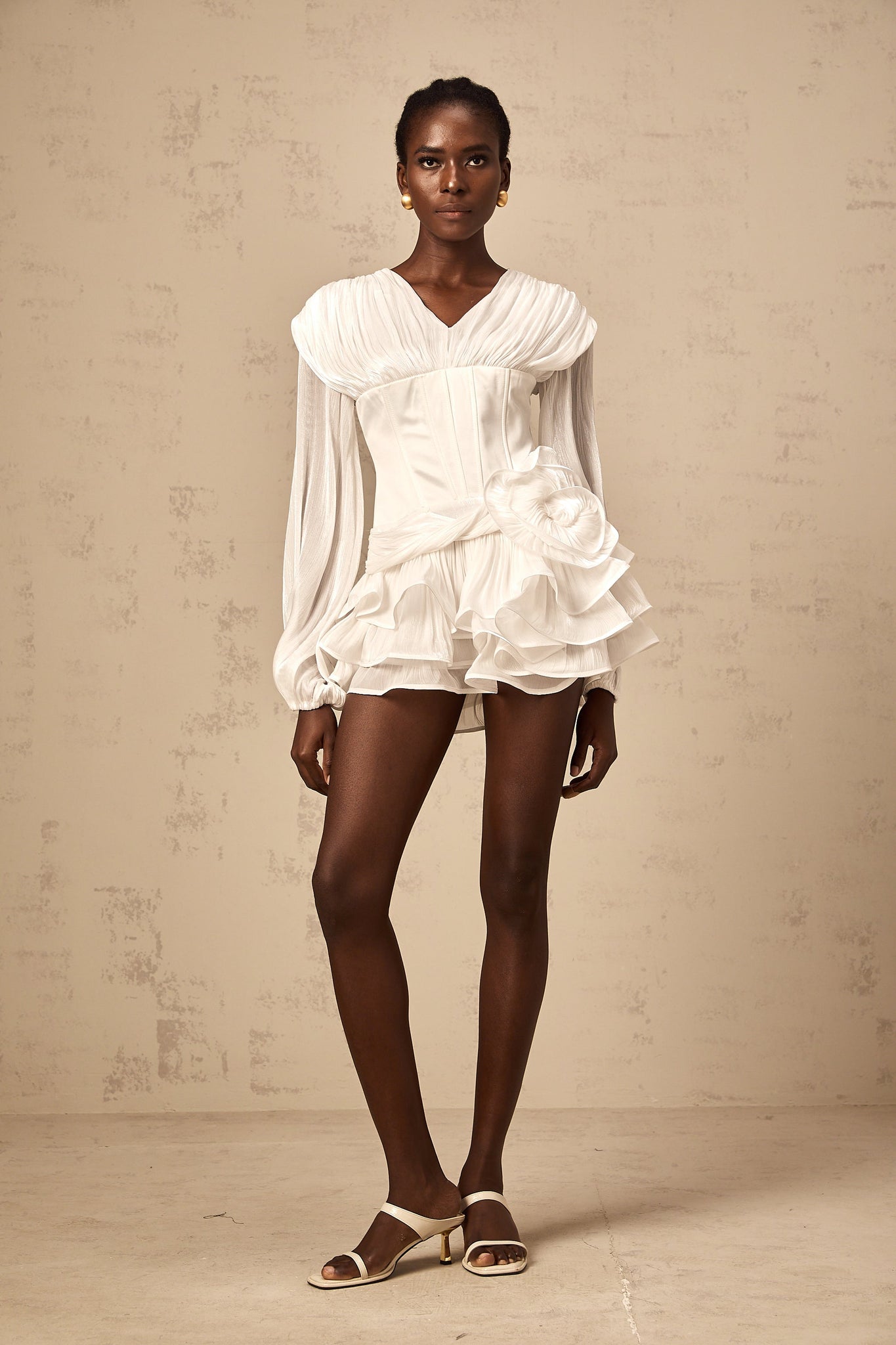 Structured mini dress with puff sleeves, layered ruffles, and a draped flower at the waist.
